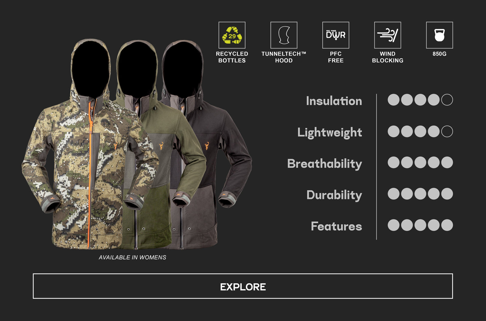 A hybrid that bridges the middle and outer layers. Blocking out around 90% of the wind, while keeping you warm when glassing and stalking without overheating and breathes remarkably well. Packed with pockets and features to excel in a variety of circumstances.