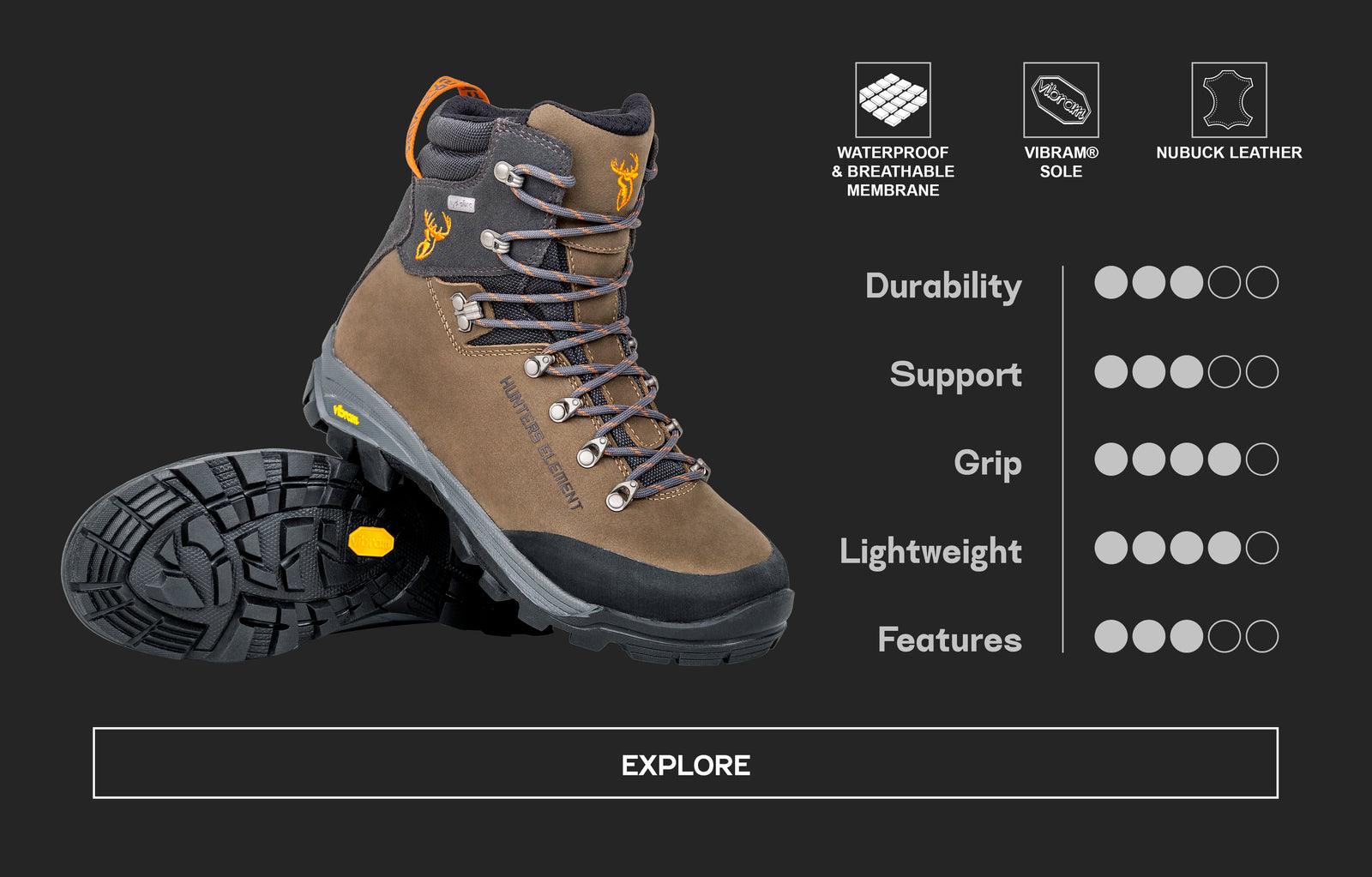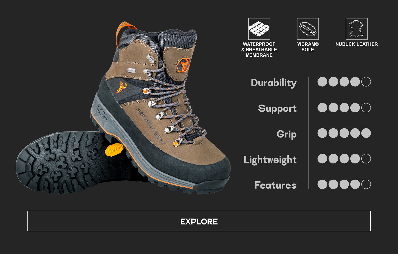 A good hunting boot is one that offers a higher cut than a regular shoe, ensuring you have ankle support on uneven ground, and protecting you from rocks and scree.