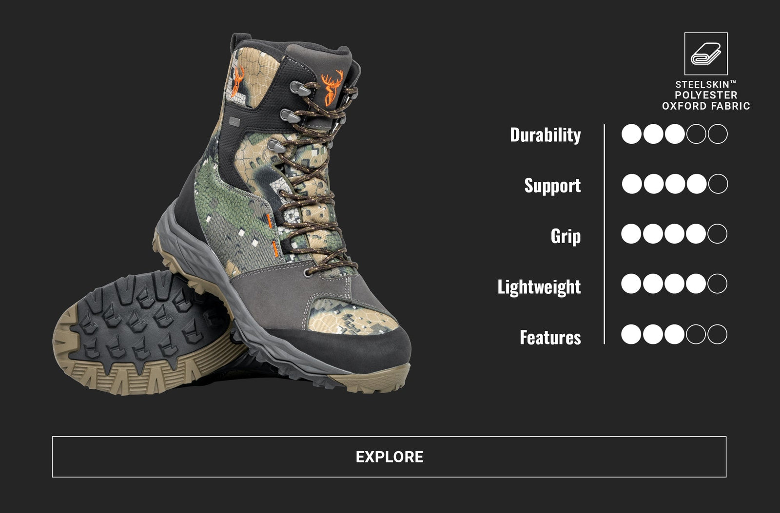 A super lightweight hiking boot for silent bush stalking. STEELskin™ Polyester Oxford fabric retains almost no water and an aggressive outsole provides great grip in muddy terrain.