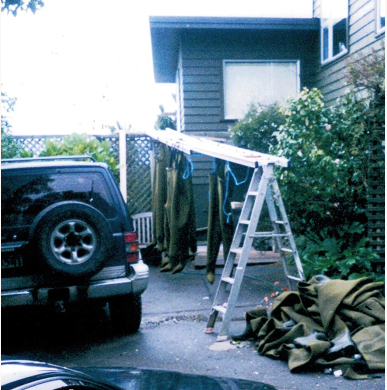 “I’ll start back at the beginning, I first started with neoprene waders...I got a heap of them out the door before white baiting season, and then the phone started ringing. There was an issue with the quality... so after that I started reinforcing and water testing all of them myself, it was 700 pairs in the end. I had these racks holding them all in the Wellington Southerly and trying to dry them in the middle of winter".